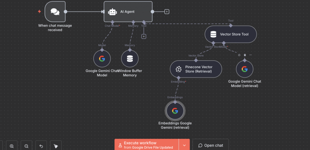 - Vector Store Tool → Pinecone Vector Store (Retrieval) + Embeddings Google Gemini (retrieval) + Google Gemini Chat Model (retrieval)