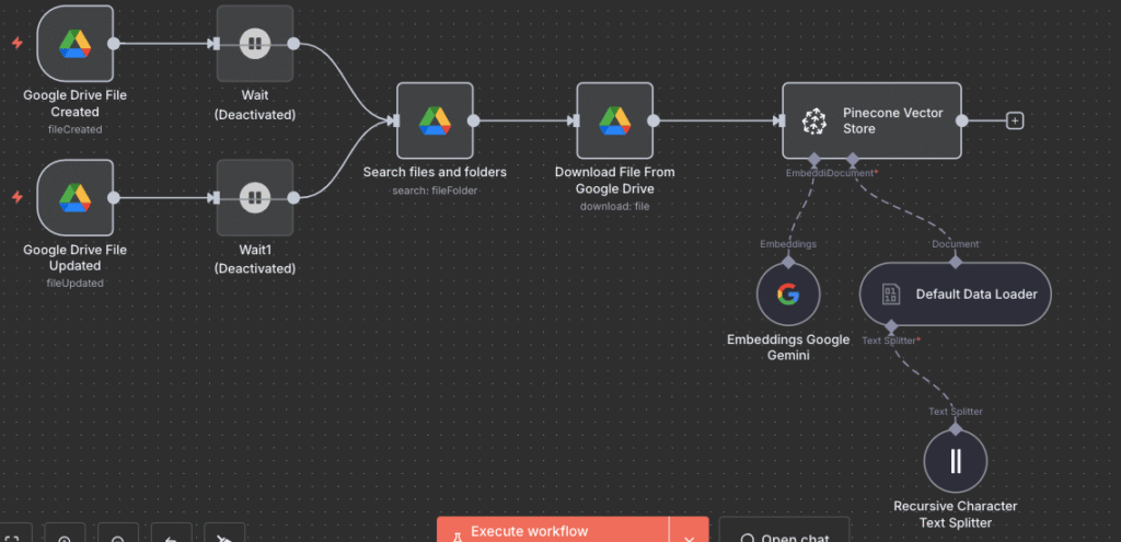 - Google Drive File Created and File Updated → (optionally Wait) → Search files and folders → Download File From Google Drive (with conversion) → Default Data Loader → Recursive Character Text Splitter → Embeddings Google Gemini → Pinecone Vector Store (insert/upsert).