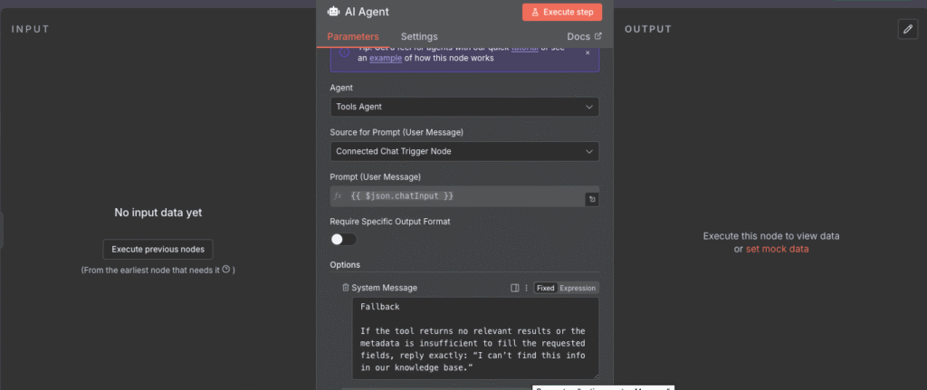- AI Agent with a strict system message (sales assistant persona, tool-first answering, no reformatting numbers, fallback if not grounded).